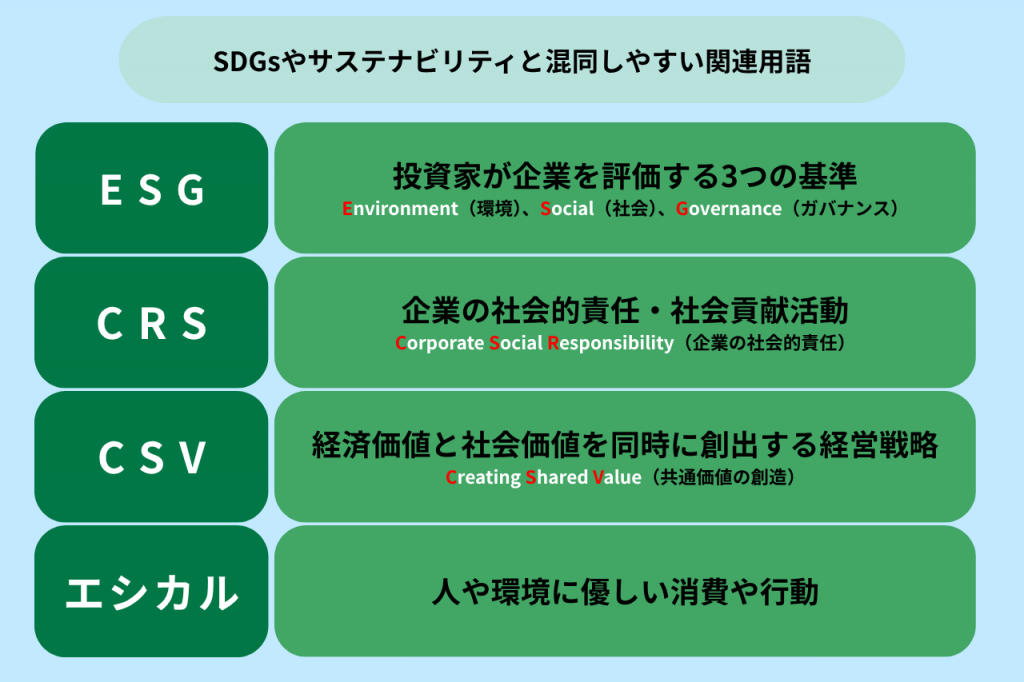 SDGsやサステナビリティと混同しやすい関連用語